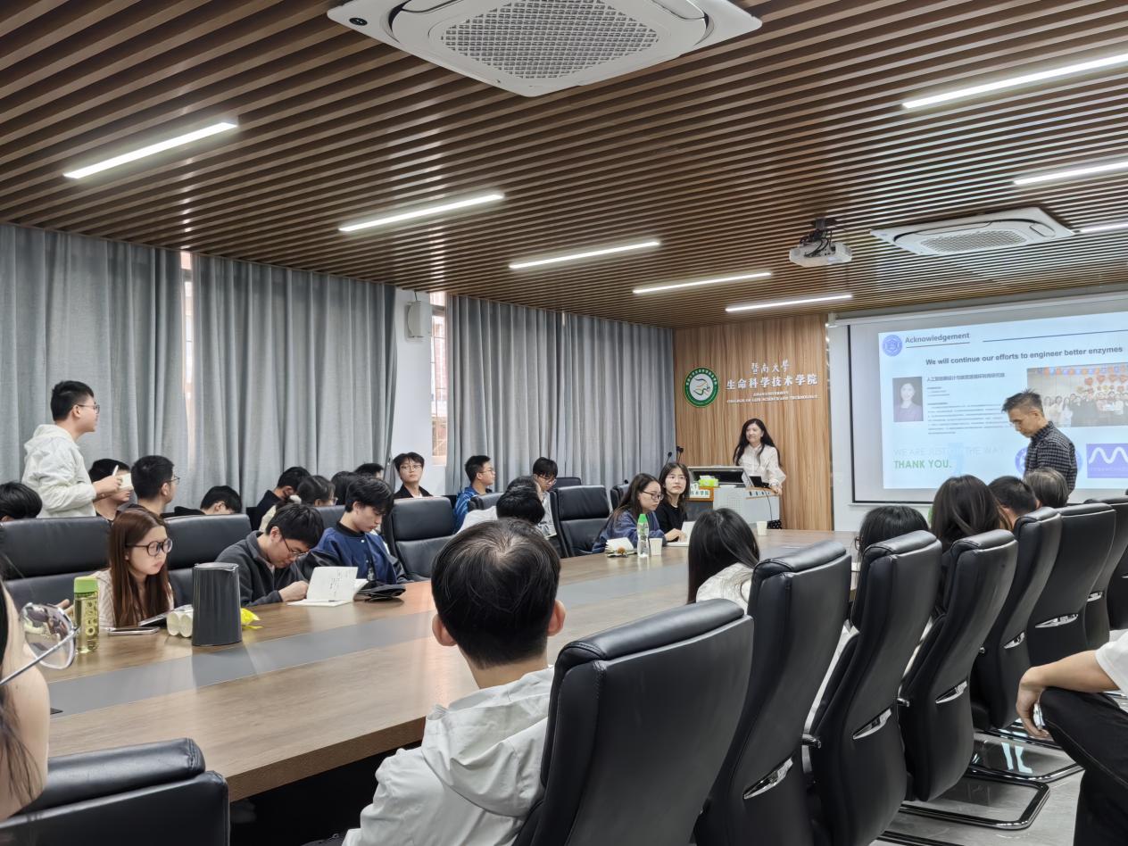 报告会上,崔颖璐研究员以“计算蛋白设计与酶催化”为主题,系统阐述了计算方法在现代酶工程中的应用框架与策略,重点介绍了基于机器学习与物理模型的蛋白质设计如何提升酶的催化性能、稳定性以及新功能创制,结合团队研究工作的典型案例,提出了“基于大规模序列空间导航的高效重构路线”等创新性观点,强调通过in silico设计与实验验证协同优化可以显著缩短传统酶工程路径并提高成功率。在场师生就计算蛋白设计等问题与崔博士进行了热烈而深入的探讨。